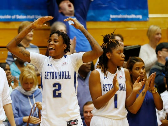 Tiffany Jones (left) and Tabatha Richardson-Smith (right) combined for 36 points and 22 rebounds as Seton Hall annihilated Rutgers, 77-49. (Photo courtesy of USA Today)