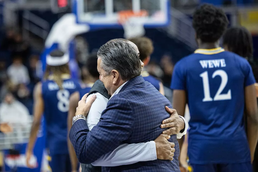 Tom Pecora shares pregame hug with Speedy Claxton as Pecora’s Quinnipiac team visited Hofstra. Pecora recruited Claxton while a Hofstra assistant, and coached on Long Island for first time since leaving Hofstra in 2010. (Photo by Matteo Bracco/Hofstra Athletics)