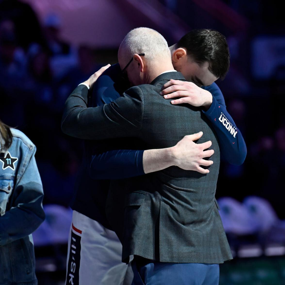 Alex Karaban and Dan Hurley share pregame hug before Karaban became first active UConn player inducted into Huskies of Honor as part of senior day ceremonies before Saturday’s win over Seton Hall. (Photo by Jessica Hill/Associated Press)