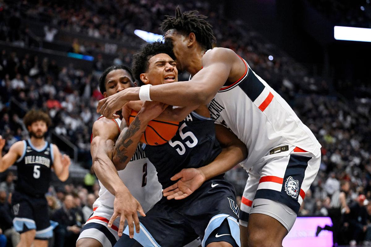 Silas Demary, Jr. (left) and Tarris Reed, Jr. (right) fight Villanova’s Acaden Lewis for rebound in UConn’s win over Wildcats Saturday. Head coach Dan Hurley has voiced continued concern over Huskies’ rebounding issues. (Photo by Jessica Hill/Associated Press)